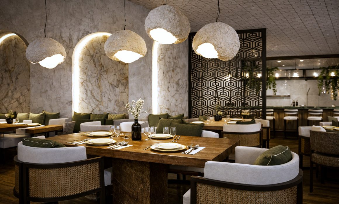 Lighting is conceived as an atmospheric element, using indirect and low-intensity sources to enhance surfaces and define dining areas. Light accentuates curved forms and textures, creating depth and an inviting, intimate ambiance.